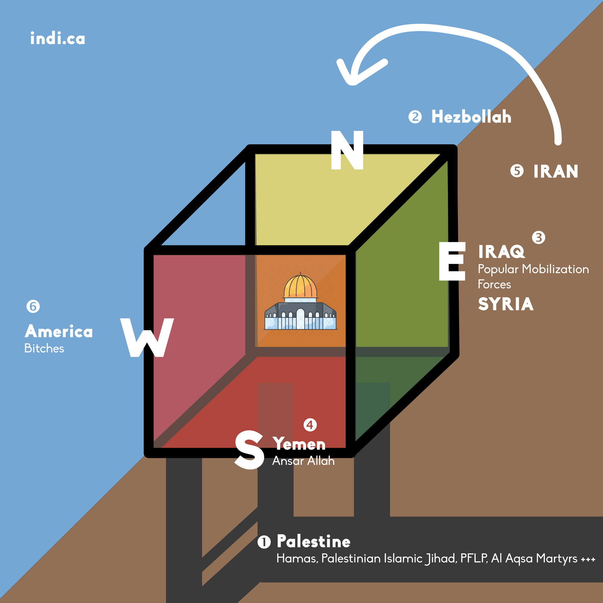 The Al Aqsa Mosque in Al Quds—the at the center of the six-front infographic above—is the spiritual heart of this struggle. It's why Hamas called the battle the Al Aqsa Flood. The Carbon Crusaders defile this (and honestly, all) holy sites in Islam, but this can't go on forever. Because 'Israel's' six front war is just part of a six-front world war that its parent empire (America) is fighting, and losing. 'Israel's six-front 'cube of fucked' is contained in a higher dimensional cube of even greater fuckery, the collapse of American (ie, White) Empire on multiple fronts. And that cube is contained in an even higher-dimension, the collapse of the entire ecosystem, because of all the carbon crusading! There are wheels within wheels, and they're all broken.