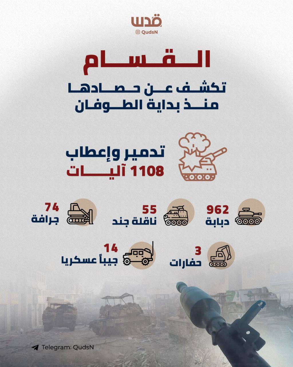 In their 120-day summary of activities, Hamas's army, Al Qassam, has hit over 1,000 tanks and vehicles. They report: