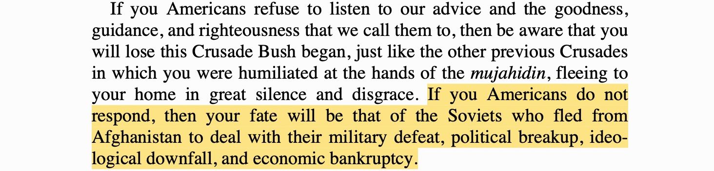 In the end things played out just like Bin Laden predicted. As he wrote in his Letter To The Americans: