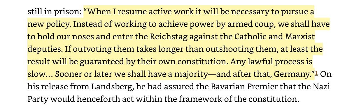 You wonder how Germans fell into fascism, but then you look at America today. Compared to America, the Germans really tried. Germany arrested Hitler in 1924, centrists tried ruling by Presidential decree for a while, and then the Nazis came roaring back in 1932. The process took eight years.