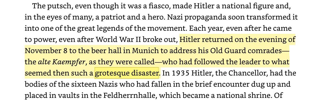 Within two days of the putsch Hitler was arrested and the Nazi party and propaganda shut down. He was, however, let out nine months later and told to play nice within democracy and he was like “OK, fine, I’ll get in that way.”