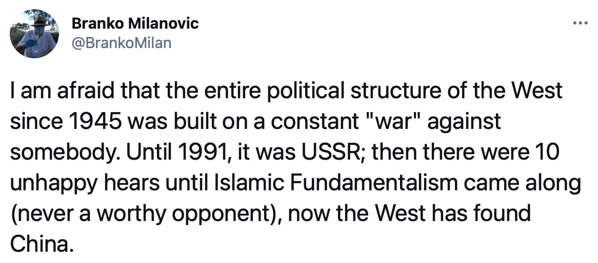 This isn’t crazy talk. This is mainstream American thought. Republicans say the same stuff outright. Democrats continue the same policies politely. Trump talked the exact same shit about China and Biden has kept the exact same policies.