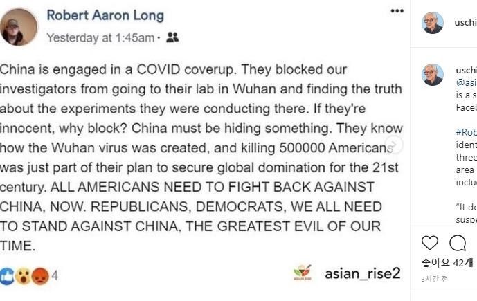 People are appalled at this lone-wolf murder by Robert Long, but not the pack-wolf attacks on ‘China’. That’s the problem. This is not one crazy person. This is your whole crazy culture. Long’s views are not far out of the mainstream. They’re not even that far from the current regime.