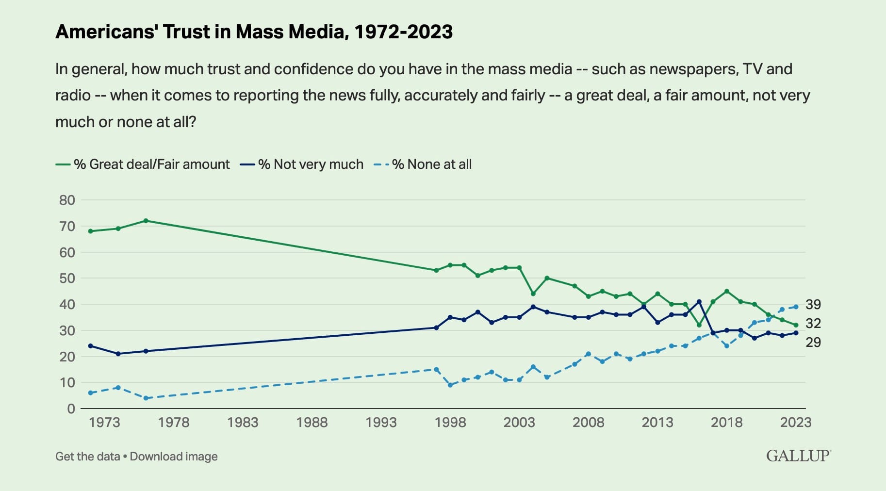 American mass media is now rejected by the masses en masse. According to recurring Gallup polls, a majority (68%) of Americans do not trust the mass media, and a plurality (39%) do not trust it at all. The talking heads blather on, but the eyeballs have moved on. An average MSNBC show now gets less views than many Twitch streamers, or just people showing their butts on OnlyFans.