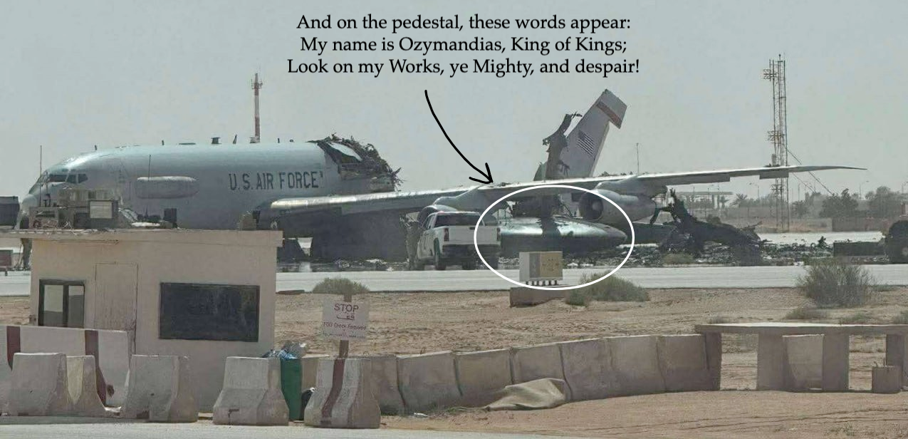 Iran has found the kill switch on the kill chain which is that every rich man's house has a servants entrance. America never built underground or even hardened shelters for its fighters, so they have to be served by ancient refuelers, which are about as limber as an ancestral butler. America also lost their ground-radars in the first week, so they have to get surveillance from airborne units, which still have to park somewhere.