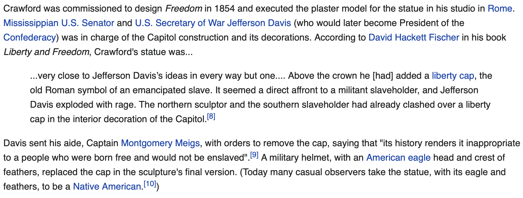 A fascinating bit of history about the weird eagle/chicken hat on the (plaster) statue above. It was put there by Jefferson Davis, President of the Confederacy, to replace the artists’s symbol of an emancipated slave.