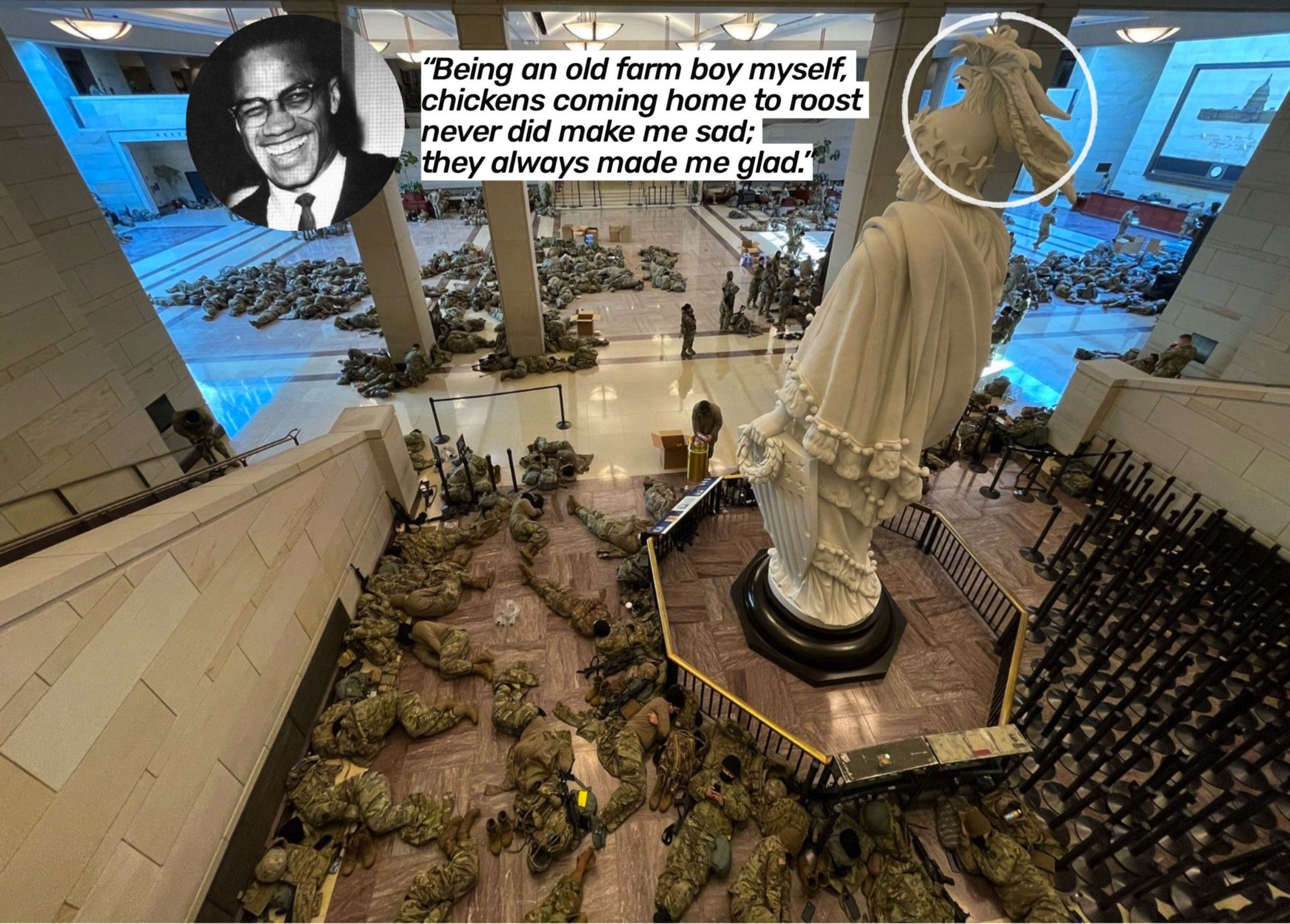 The Capitol mob and the National Guard are two sides of the same bloody coin. This is precisely what America does. You destroy countries and then send in troops to ‘keep the peace’ that you destroyed. This is textbook pointless American imperialism, breaking things, pretending to fix them, never understanding that you are the problem. This is you, America. This is precisely who you are. This is how you deserve to go down, hearing the boots of your own stormtroopers on your own marble halls, not liking the sound.