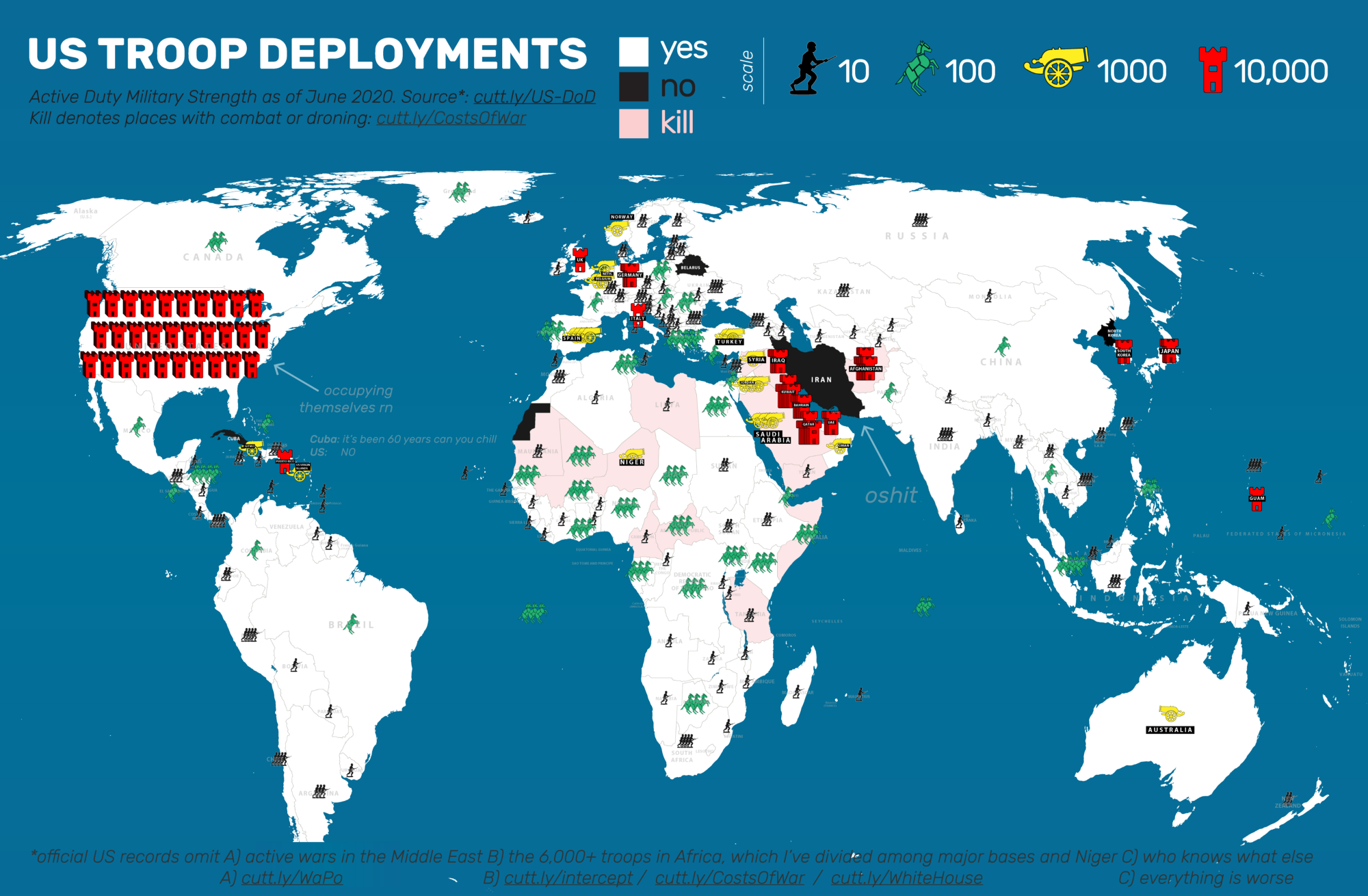 This is a map of US troop deployments across the world, depicted as a Risk game. It’s so monstrous you’ll really have to zoom. The only places America doesn’t have some troop presence (ranging from a few Embassy Marines to full occupations) are effectively besieged. Look at Iran in the middle of your aggression, and how you somehow portray them as the problem. America is at constant war everywhere and you’re not the good guys. After years of torture, rendition, death, and over 37 million displaced, don’t you get it? After losing every war while mercenaries profit, don’t you understand? YOU’RE THE BADDIES.