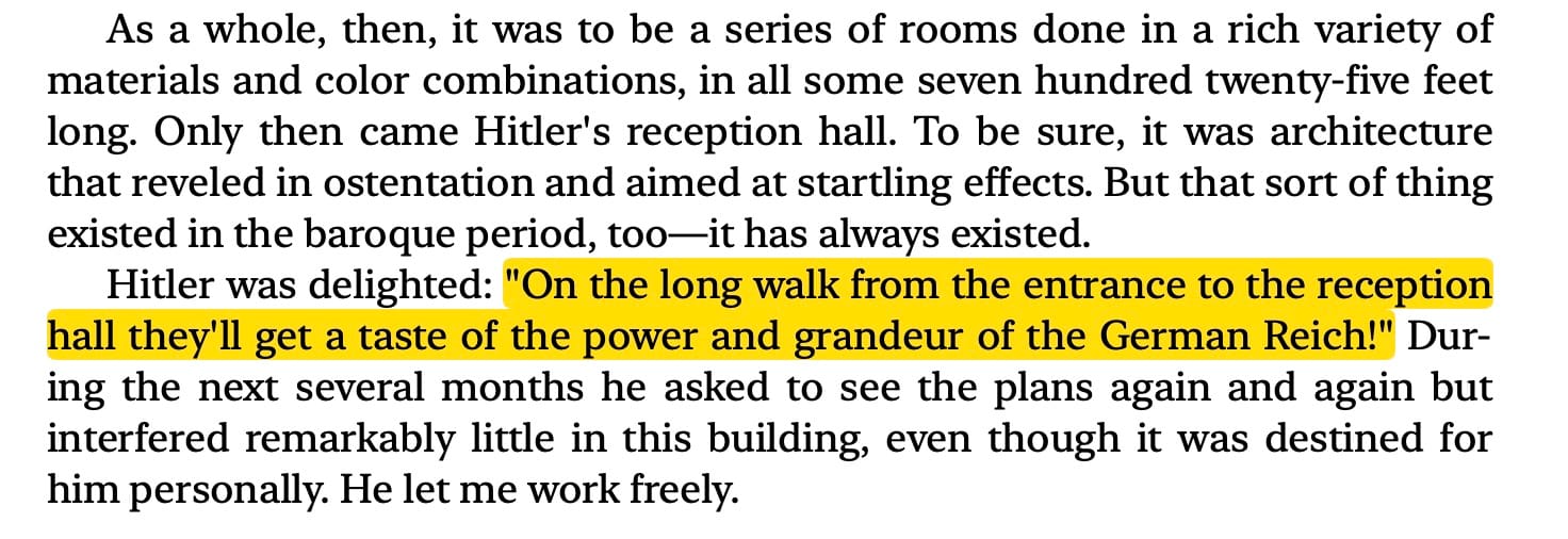 Hitler's a shit artist, this is well established. But Hitler did have a great eye for art, and the theatrical. Hitler said, “A precocious revolutionary in politics I was no less a precocious revolutionary in art,” and he was, in his way. Nazi iconography, cinematography, and graphic design were state of the art, and he was the patron of all of it. Hitler could recognize talent, and let them have at it. Hitler's general brief was, “My surroundings must look magnificent. Then my simplicity makes a striking effect.” Thus he gave Speer a free hand to design the New Reich Chancellery. Describing it, Speer said,