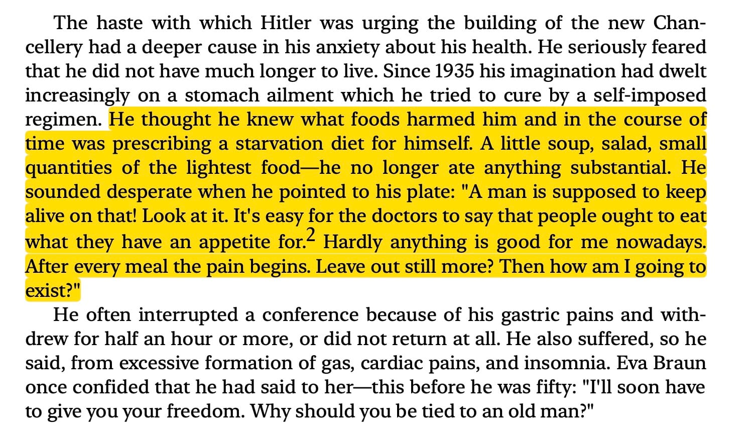This then transitions into how Hitler starts shooting some concoction of cocaine and morphine and amphetamines every day as ‘vitamins’ from “Dr. Theodor Morell. Skin and Venereal Diseases.” Speer's memoirs are fascinating, just absolutely bonkers Nazi shit was going on.