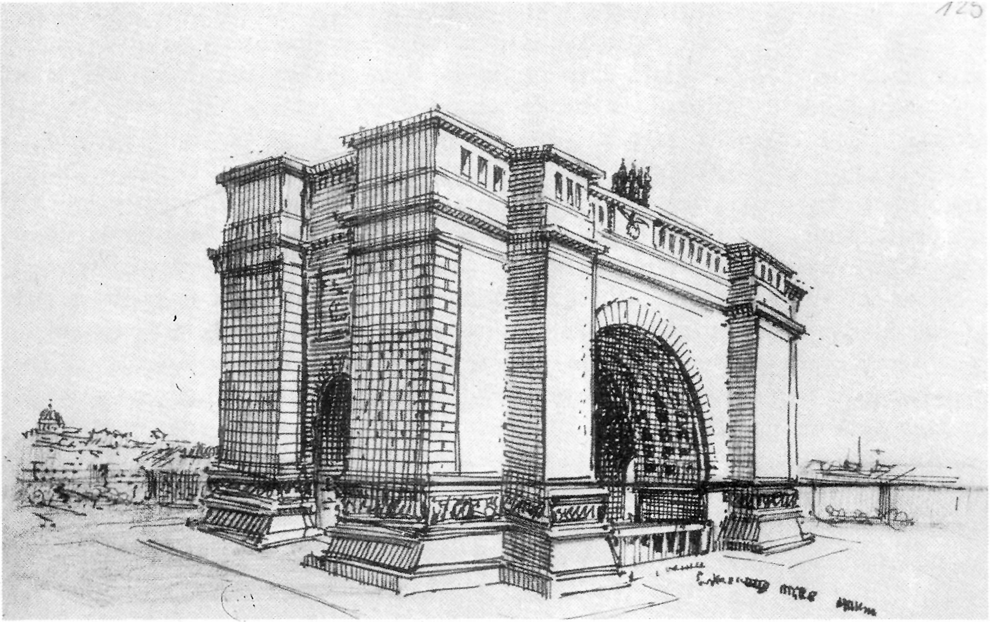 The better work Speer referred to is the Triumphbogen by Hitler, which sounds like a particularly difficult and rewarding booger. This later (1925) sketch is better but still fails at basic perspective. The right side just droops down for no physical or artistic reason. And the thing looks like a dog house.