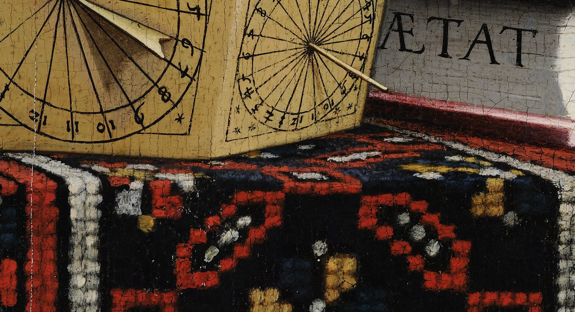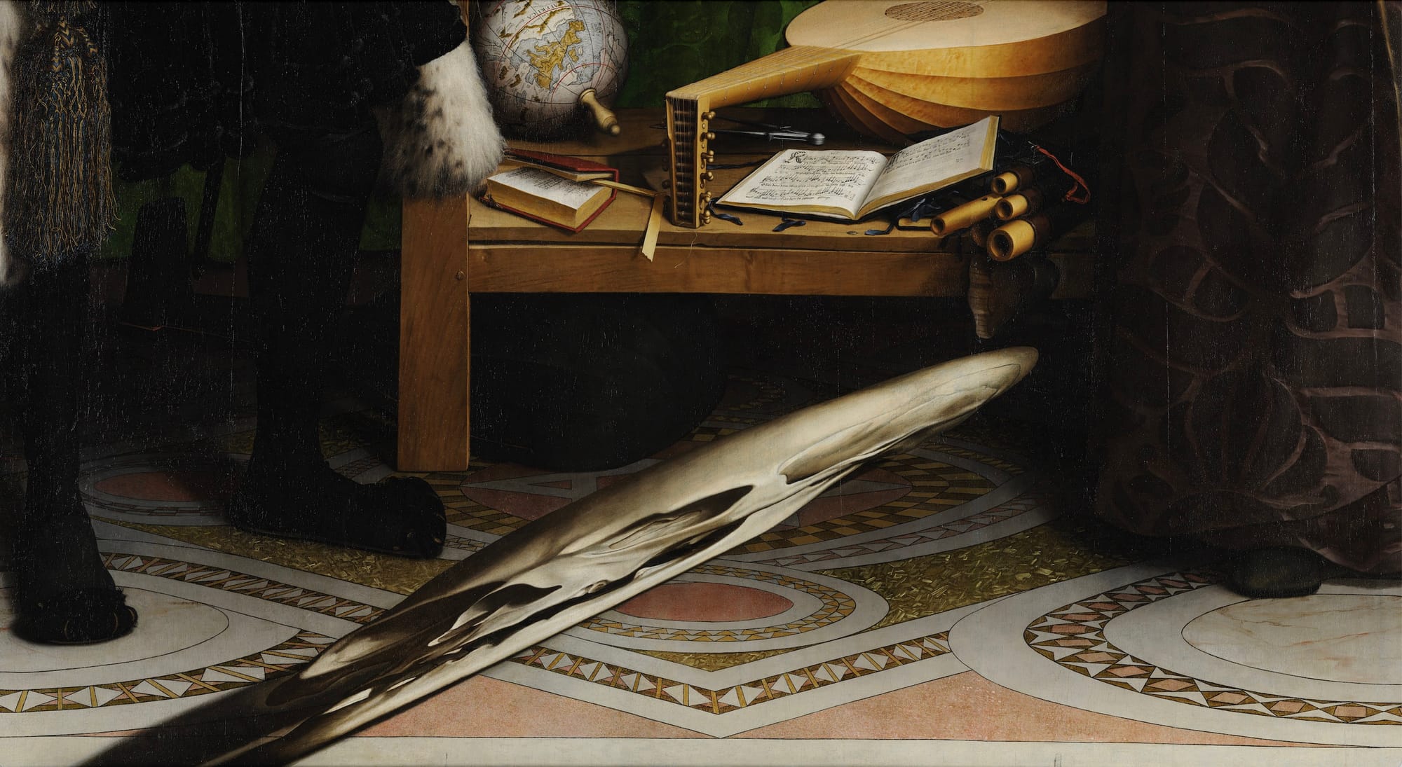 You're supposed to be able to view this memento mori at an oblique angle, from the very side of the painting. Or maybe through a glass tube. I don't quite get it but it's very cool.
