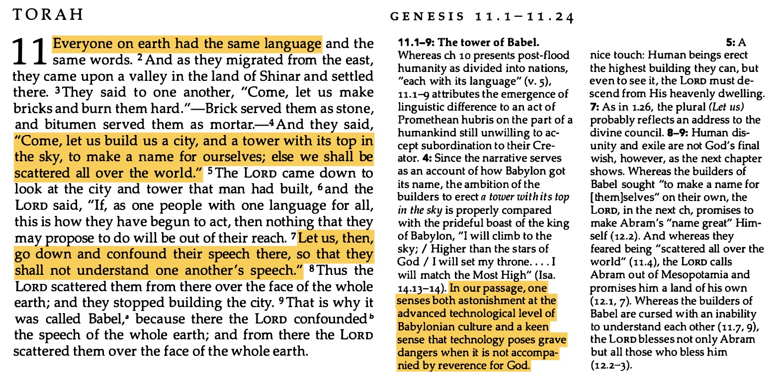 In the story of Babel—which might as well be future as past—man develops one language in one city until “there the LORD confounded the speech of the whole earth; and from there the LORD scattered them over the face of the whole earth.” That's His story, at least, which repeats throughout history because mortals decease so quickly and forget. As the Tanakh Translation of the Old Testament comments, “In our passage, one senses both astonishment at the advanced technological level of Babylonian culture and a keen sense that technology poses grave dangers when it is not accompanied by reverence for God.” Sound familiar? Can you hear the rhyming upon the wind?