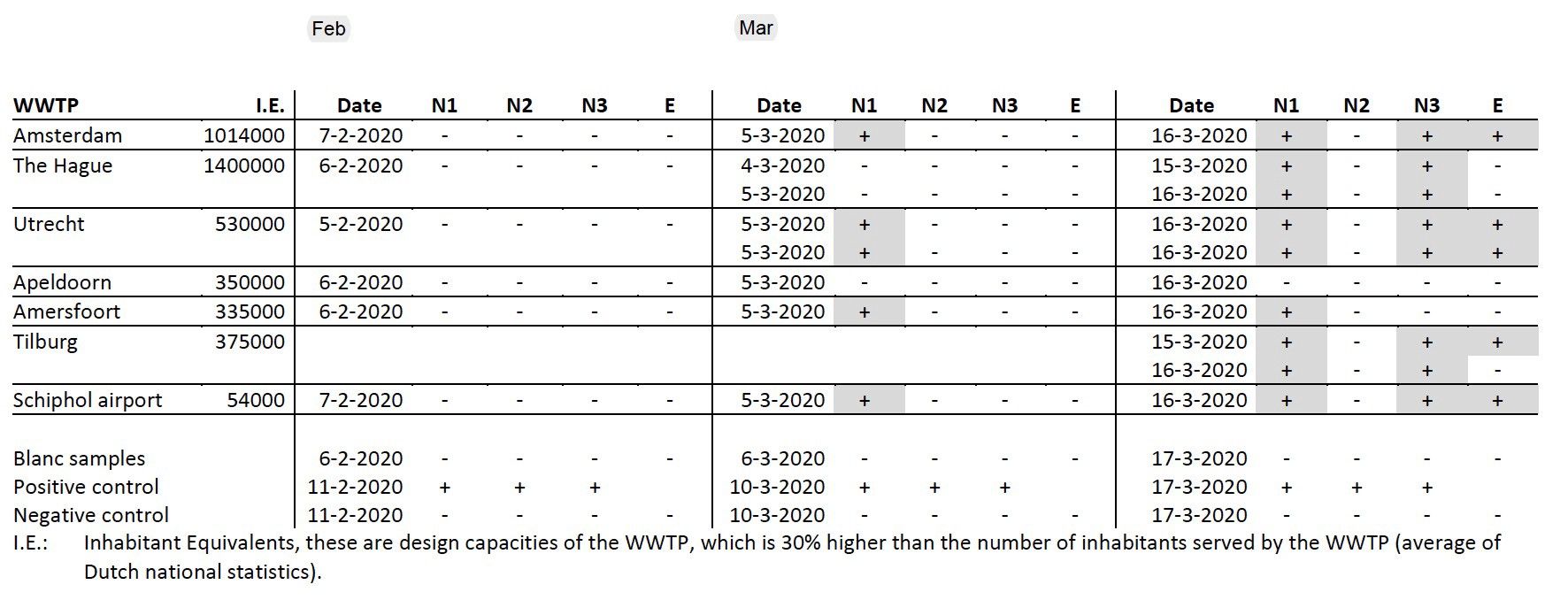 To make this easier to read, just look at the three main columns. They mark three tests, one before the virus hit, and two after. In February (before) there were no hits on any of the RNA fragments (N1–E).