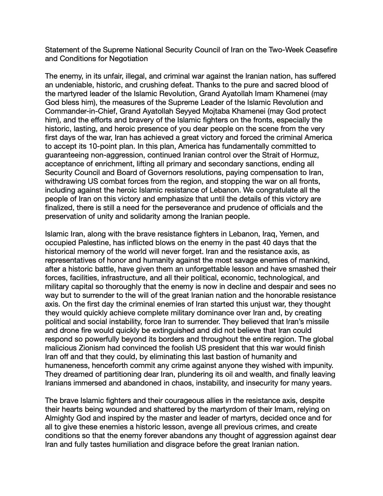 Now let's discuss the deceasedfire with White Empire, in context, if you're still around. Through Pakistan—which 'America' has sock-puppeted since jailing Imran Khan—'America' tried to negotiate a two-week ceasefire with Iran. Iran negotiated with them bazaar style, they had offered 10-points earlier and just walked away. 'America' took those 10-points and ran with them but now, just a day later, has put them in the trash can. My words, not theirs.