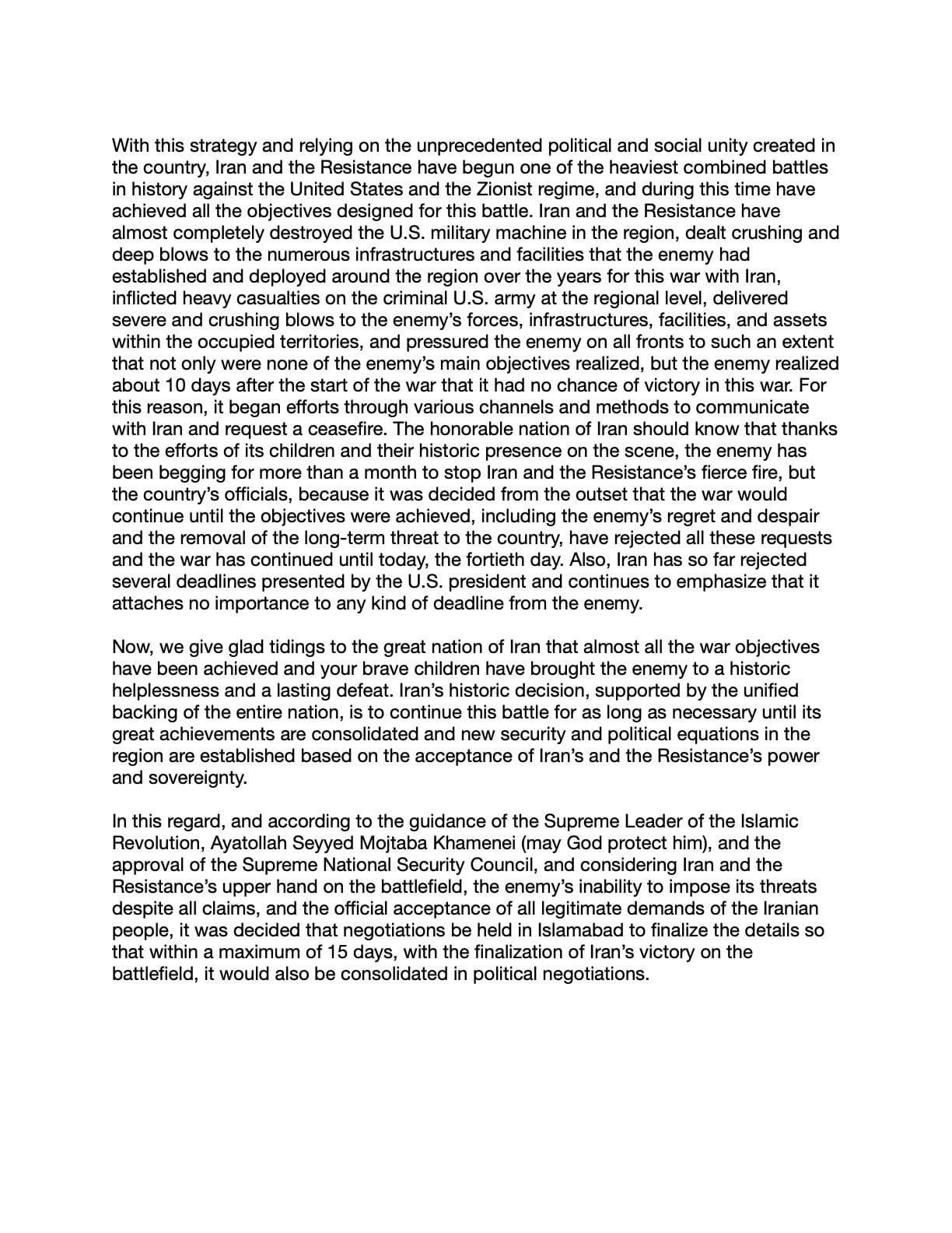 These negotiations will begin with complete distrust of the American side on Friday, April 10, in Islamabad, and Iran will allocate two weeks for these negotiations. This period can be extended by mutual agreement. It is necessary to maintain complete national unity during this time and to continue the victory celebrations with strength. The current negotiations are national and a continuation of the battlefield, and it is necessary for all people, elites, and political groups to trust this process, which is under the supervision of the Supreme Leader and the highest levels of the system, and to support it, while strictly avoiding any divisive remarks. If [America] surrendering to the enemy on the battlefield turns into a decisive political achievement in the negotiations, we will celebrate this great historic victory together; otherwise, we will fight side by side on the battlefield until all the demands of the Iranian nation are met. Our hands are on the trigger, and as soon as the enemy makes the slightest mistake, it will be responded to with full force.