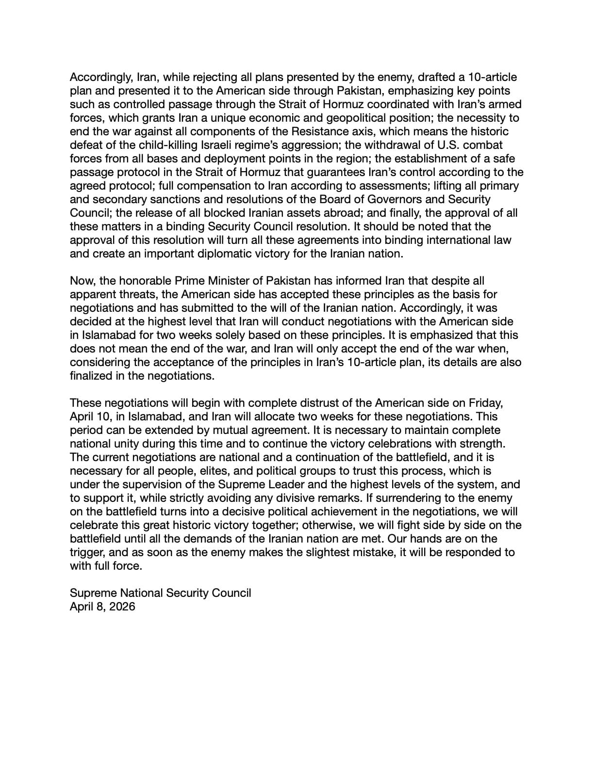 Accordingly, it was decided at the highest level that Iran will conduct negotiations with the American side in Islamabad for two weeks solely based on these principles. It is emphasized that this does not mean the end of the war, and Iran will only accept the end of the war when, considering the acceptance of the principles in Iran's 10-article plan, its details are also finalized in the negotiations.