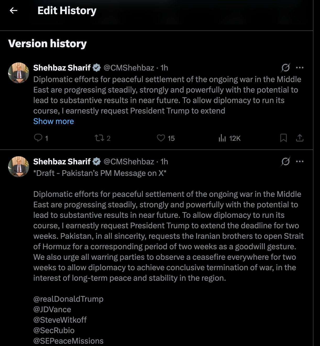 This is, of course, not what was ventriloquized through Pakistan. The Pakistani whatever, they're all illegitimate, first tweeted *Draft- Pakistan's PM Message on X* because he was just given this to say by 'America'.
