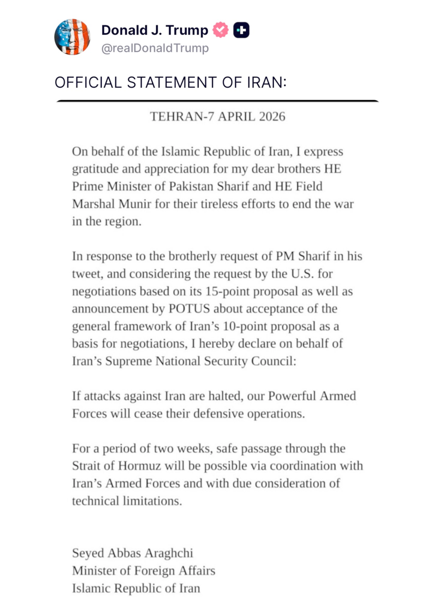 Trump himself retruthed the official statement of Iran specifically mentioning the 10-point proposal as the basis for negotiations. Did he read this? Anybody's guess, but you can read it for yourself.