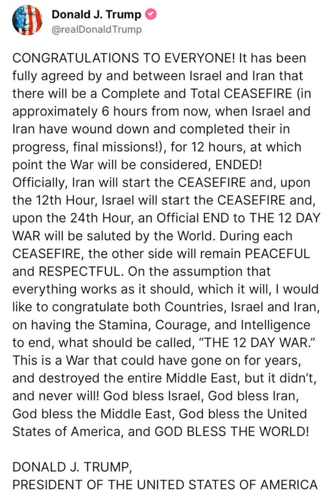 The terms (if you can call a knock-off tweet that) were that Iran stop first, 'Israel' hammer them for 12 hours more, and Iran just take it. But Iran didn't accept that at all. Indeed, much to our opposite of chagrin, Iran kept firing.