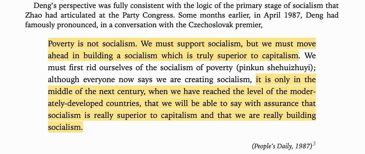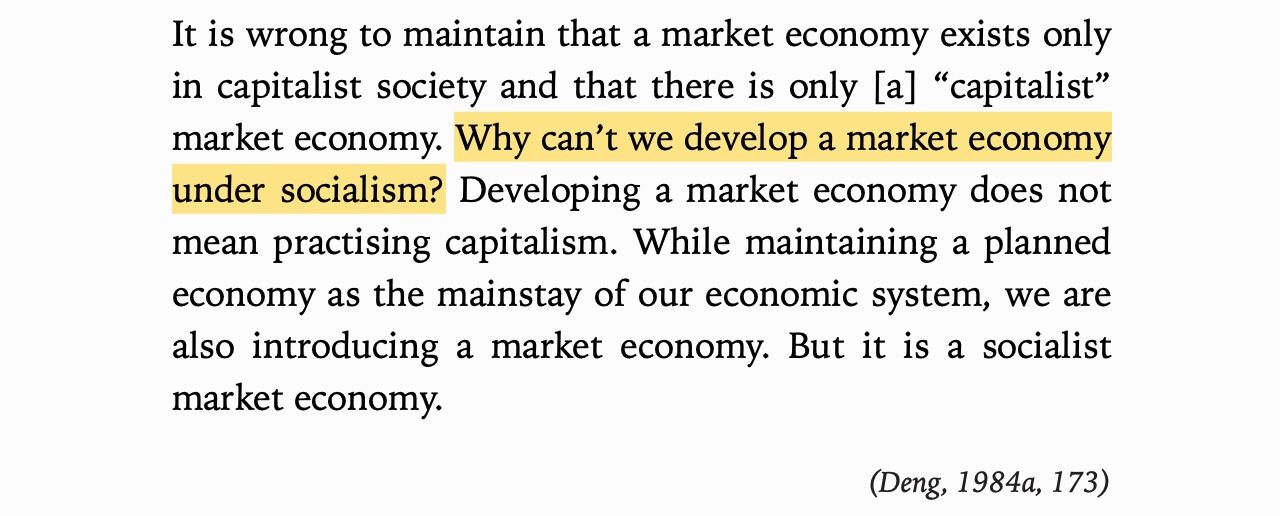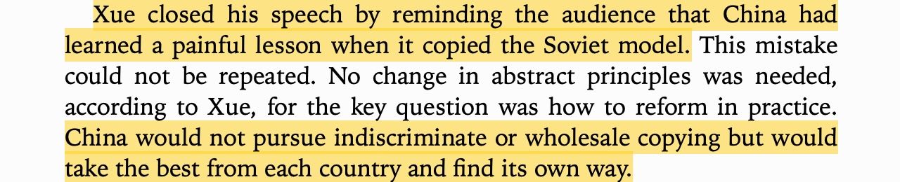 By the 1980s, the surviving cadres of the Communist Party of China (CPC) already knew this lesson well. They had copied communism wholesale from the Soviet Union in the 1950s and everyone fucking died. As the economist Xue Muqiao told a World Bank Conference in 1982 (via Weber):