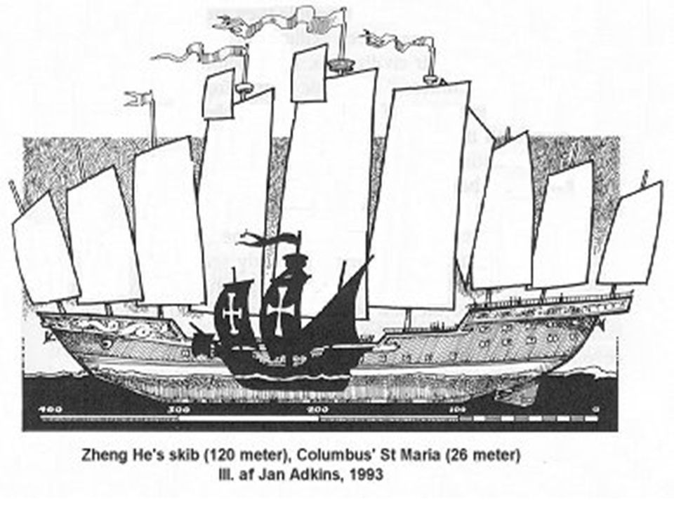Look at China’s treasure ships, above. These behemoths were bigger than the Nina, the Maria and the Pinta combined. The Ming King commissioned well over a thousand of these ships, and Zheng He rolled 60 ships deep on multiple voyages to dozens of countries, carrying easily 28,000 men. Not just soldiers, the treasure ships carried language experts, religious scholars. In the end they even stuffed our entire royal court in there when we pissed them off.