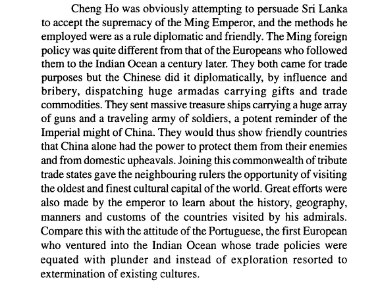 Chinese diplomatic initiatives were quite different from those of the Europeans who followed a century later. The Chinese preferred to pursue their aims by trade influence and bribery rather than by open conflict or territorial aggression. (Dewaraja, ibid)