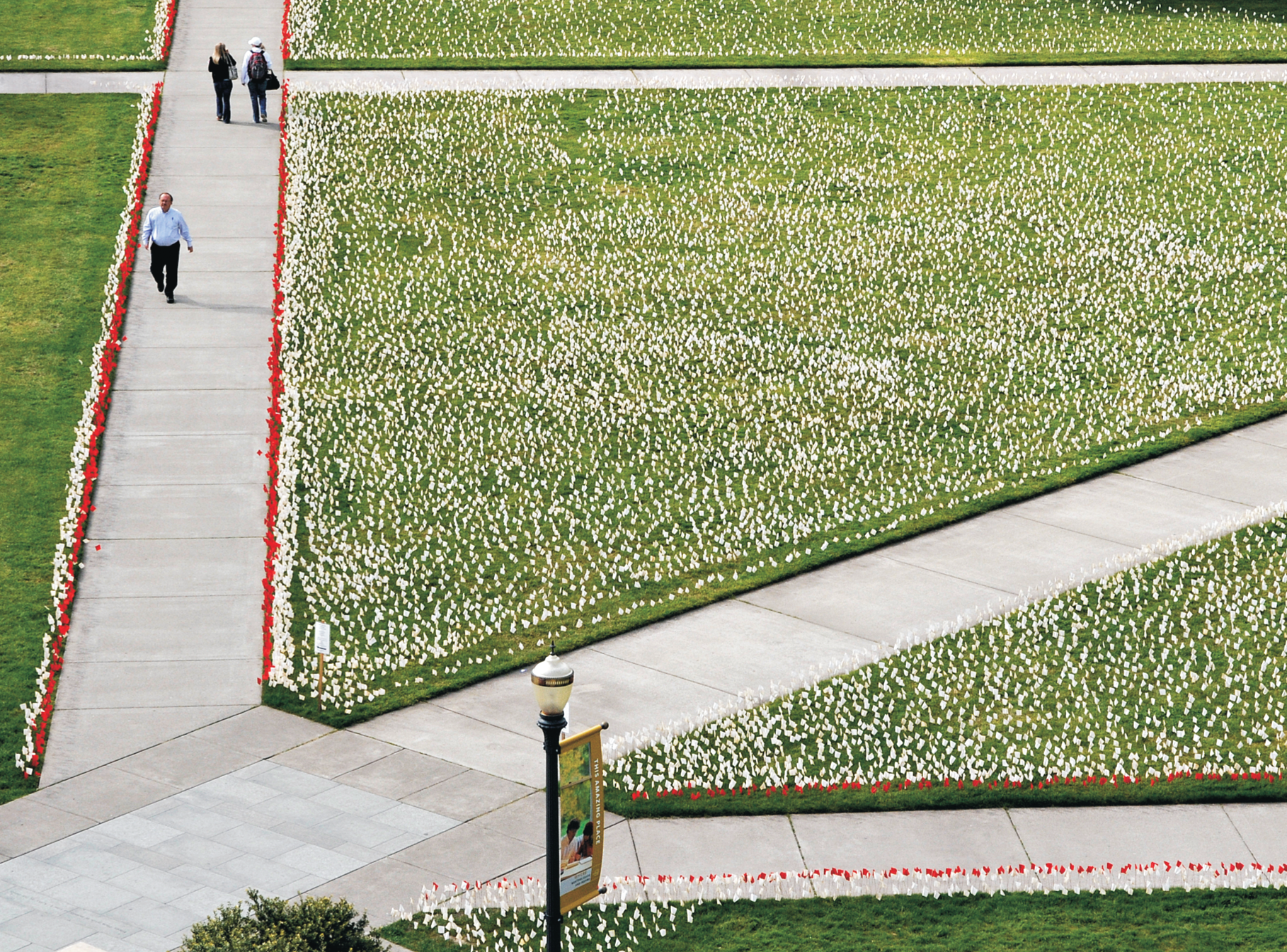 This is just propaganda which obliterates brown lives as much as all the guns and drones and jeeps. Above you can see an Oregon memorial to all the dead in the Iraq war. The red is American troops and the white is Iraqis. American media is all about how hard it was being the red line, doing the killing.