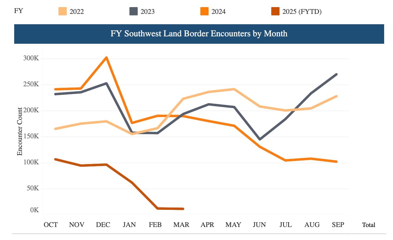 While deportations are down, fewer people are choosing to come at all. Brave, brutalized people, driven into wage slavery by America's destruction of their homes, are not braving the brutalized border anymore. ‘Encounters’ by the jealous land thieves of ICE are notably down.