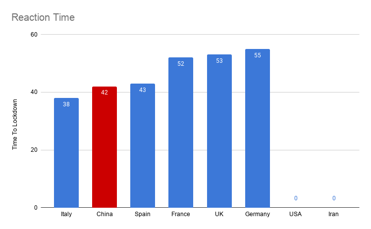 Once shit hits the fan, your reaction time is how quickly you go from being bitten by the zombie to amputating your arm. So that’s the days between first reported case and first nationally-mandated lockdown.