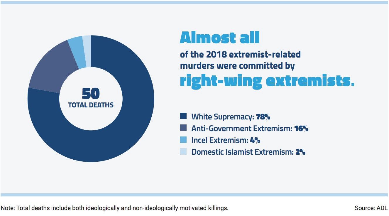 In 2018, almost all extremist attacks in the US were by right-wing extremists. Most of them white supremacists.