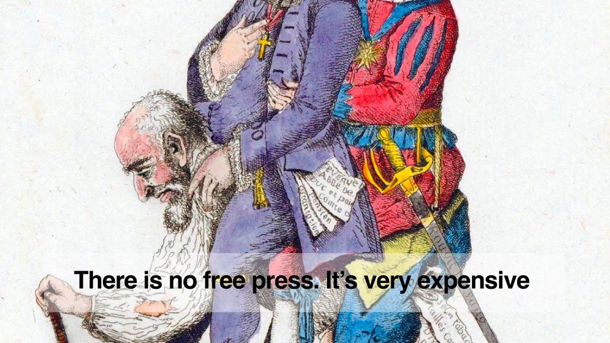 Journalism is called the fourth estate, along with the clergy, the nobility, and the commoners. It’s important to understand it as an estate no more trustworthy than priests or politicians, and as distinct from the expression of people. There is no free press at all. It’s actually very expensive.
