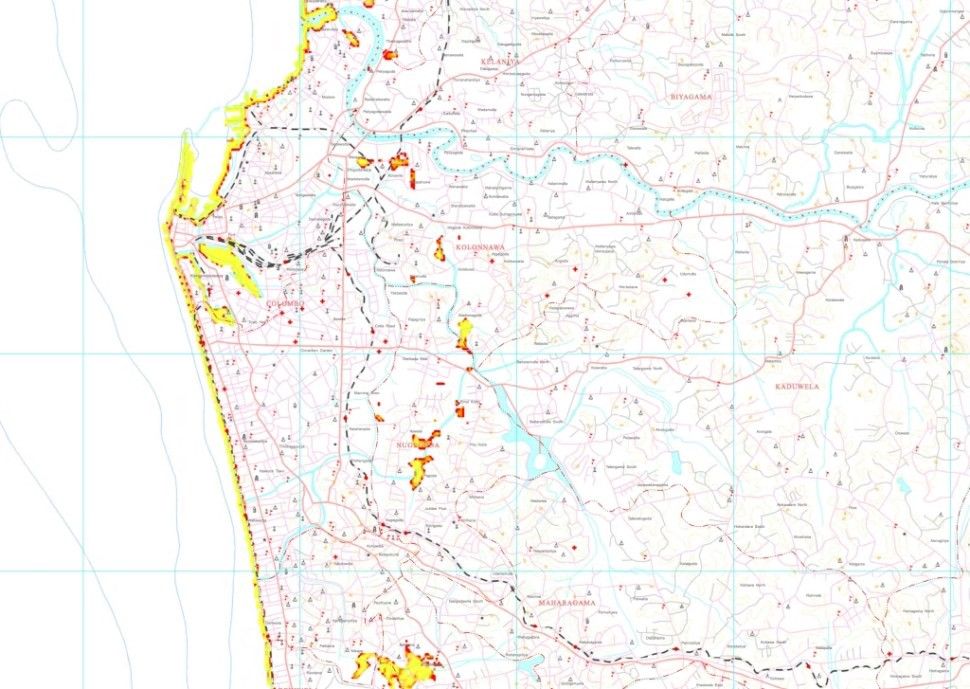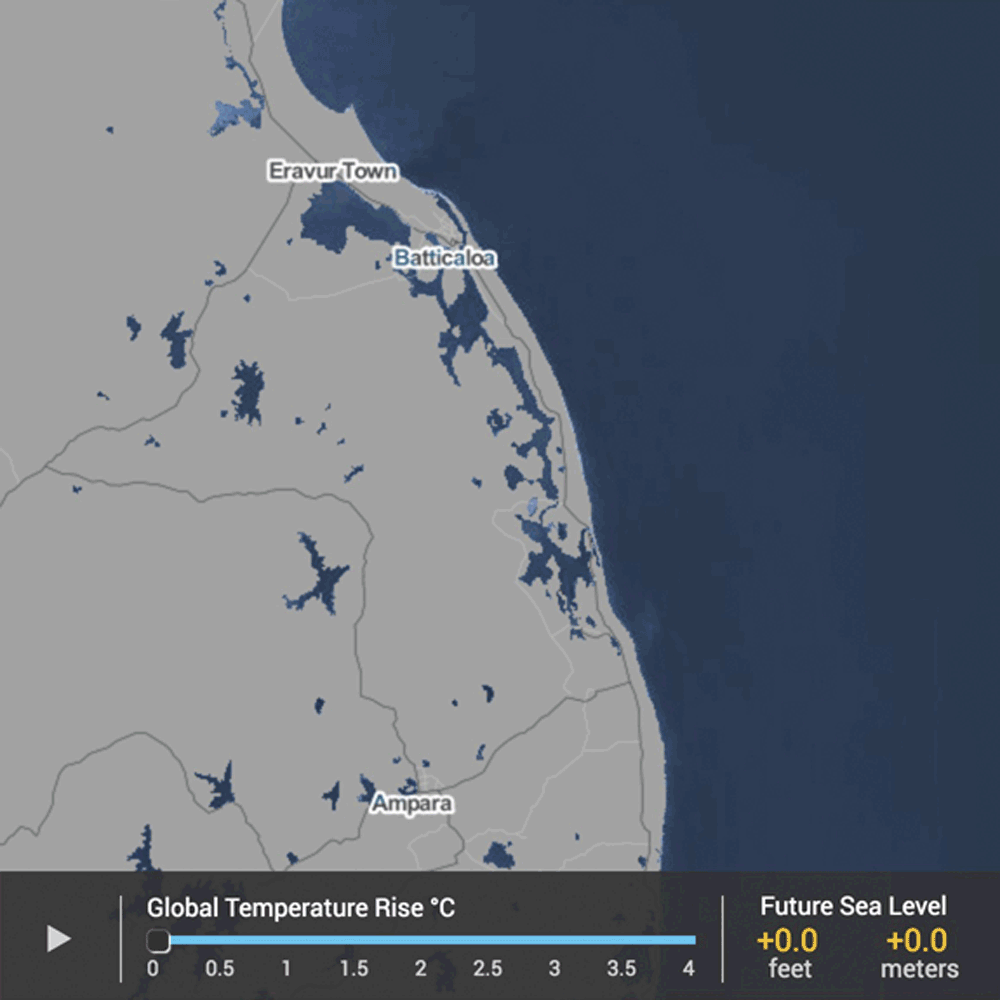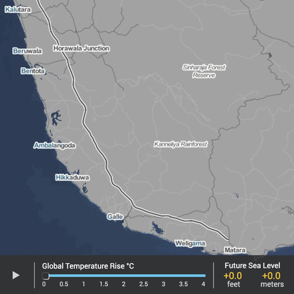 The yellow areas mark inundation levels in 2025, which has already begun, and the other colors mark up to 2100. In the next 5–10 years we’ll already begin to see Negombo going under.
