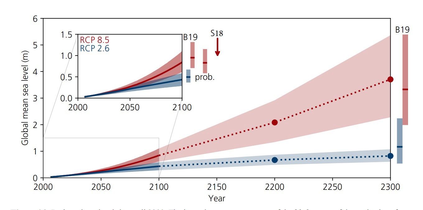 The blue line is sea level if we stopped emissions right now. That would still mean 1° of temperature change and around 0.43 m of sea level rise by 2100. The seas would still keep rising, but it could stay under a meter.