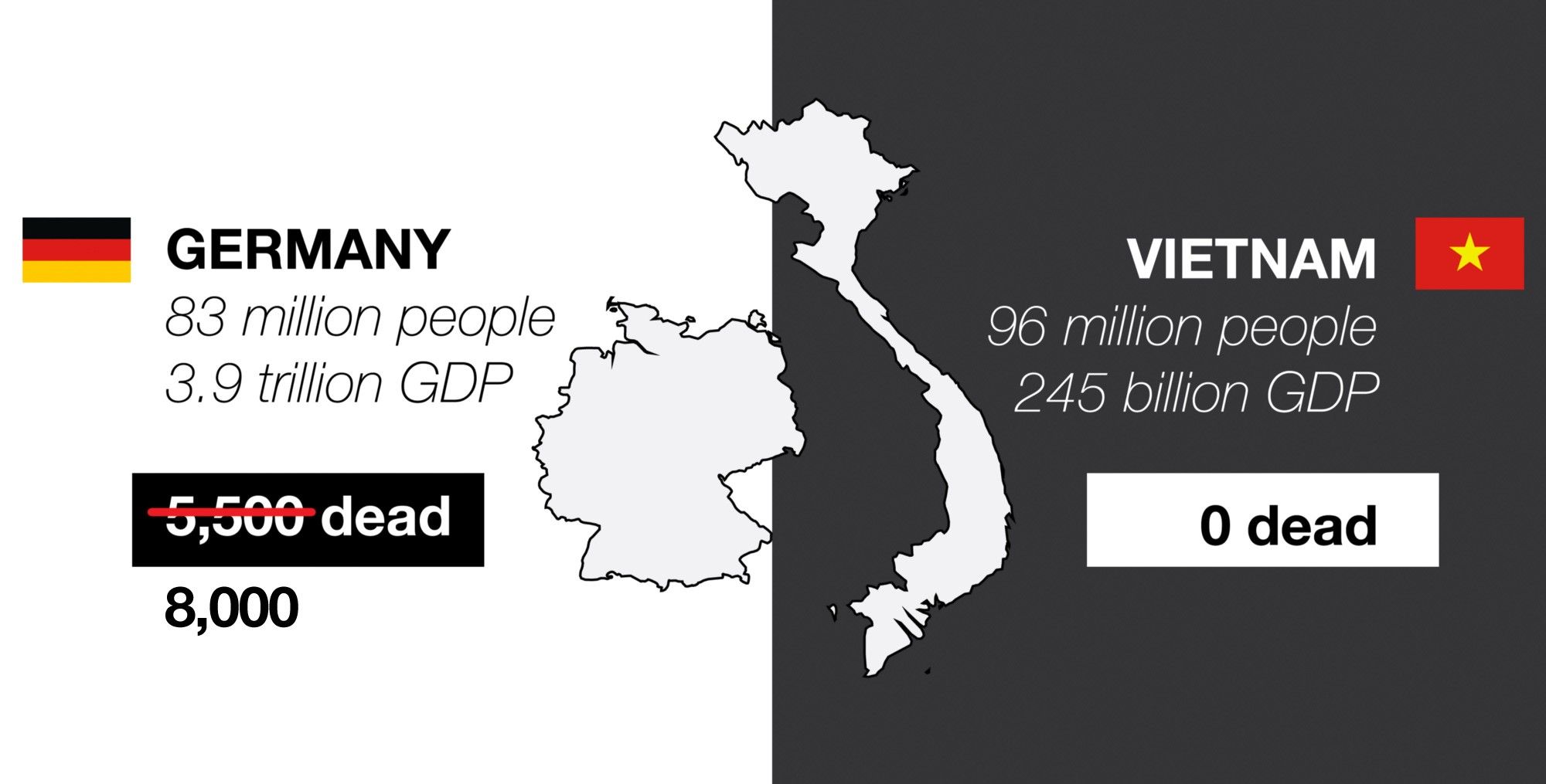 Update: I’ve sadly had to update this just a few weeks later. Germany now has over 175,000 confirmed cases and 8,000 dead. Vietnam has just 56 more cases and still zero dead.