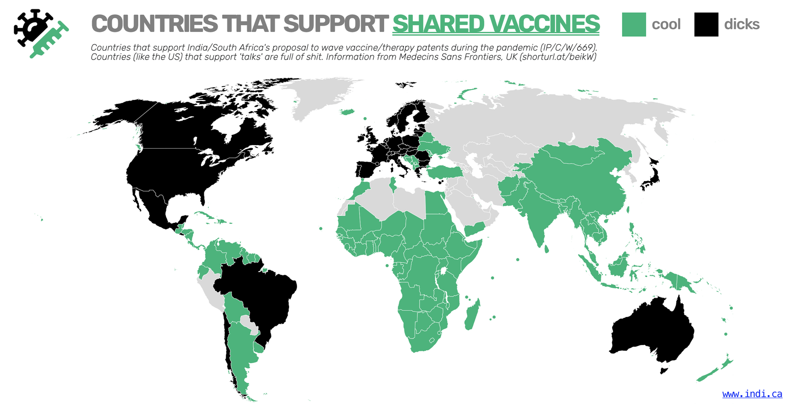 Just look at this map of people blocking the bare-minimum, waving patents during a pandemic. As much as the US has made a show of getting off this map, it's a bullshit imperial lie. Words but not action. They haven't simply approved the India/South Africa patent-free proposal on the table for months now. Like with climate change, they kill us with negotiations, and profit from the delay.