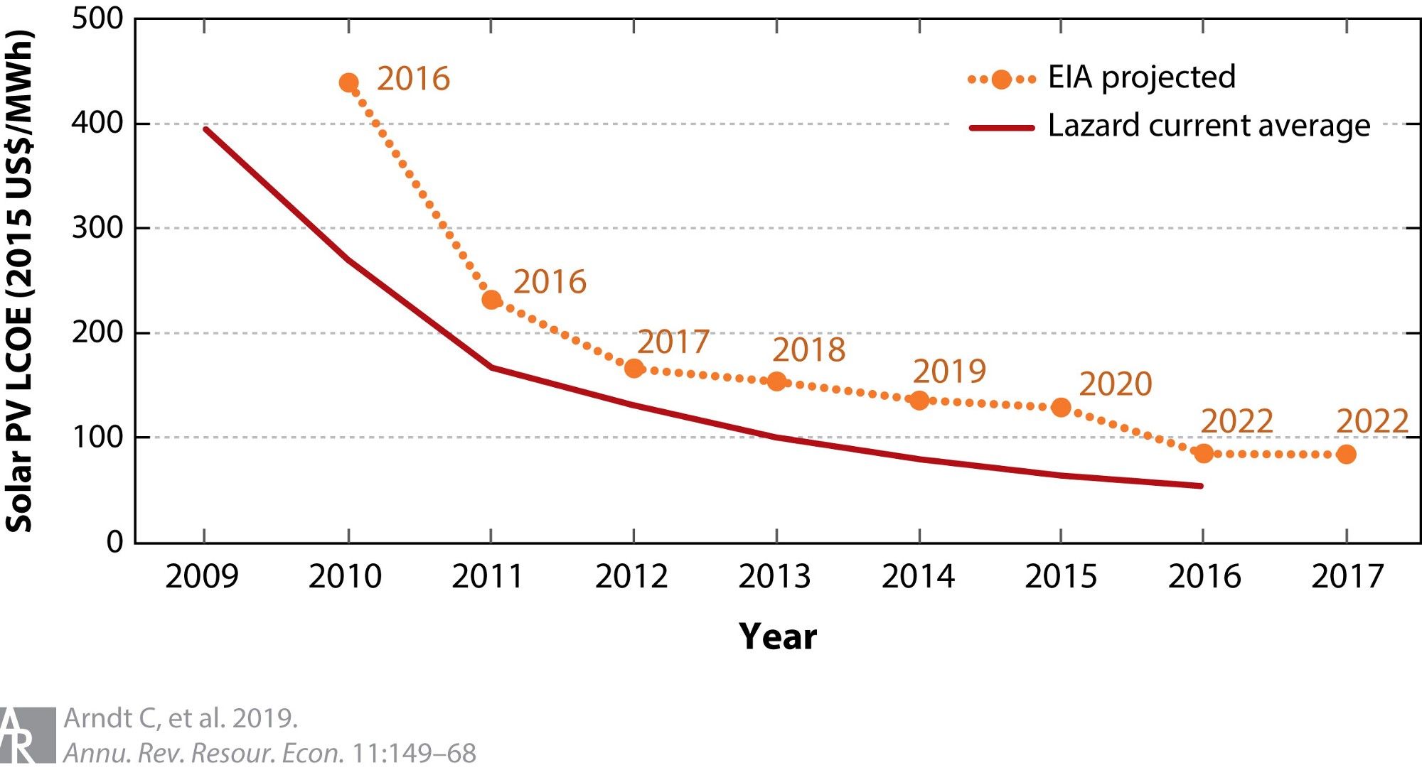 The red line shows the drop in average solar costs. The orange (on a different time scale) shows what the US Energy Information Administration projected costs to be in different years. By 2016, costs had already collapsed to projected levels for 2022, one-fifth of what the estimate for 2016 was. Unusually for any infrastructure project, renewable energy has come in early and well under budget.