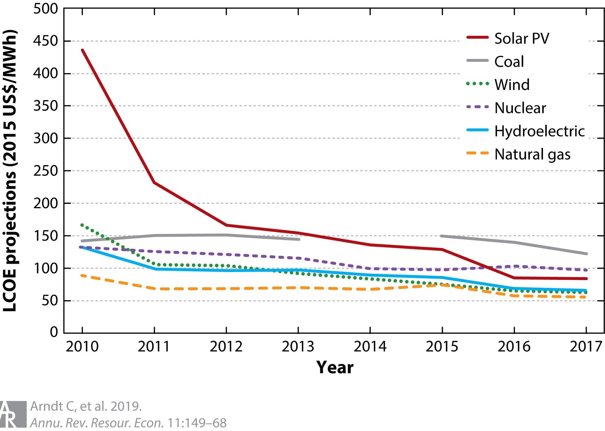 To reach this conclusion, they reviewed the levelized cost of electricity (LCOE) across multiple energy sources. Renewables are dropping the fastest. The interesting thing is that early projections consistently didn’t see this happening. Analysts saw renewables continuing to be expensive.