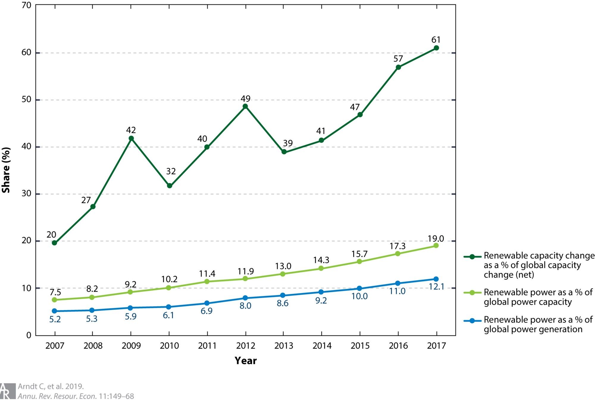 What this has meant is that renewable power has gone from 5.2% of global power generation to 12.1% by 2017. And rising.