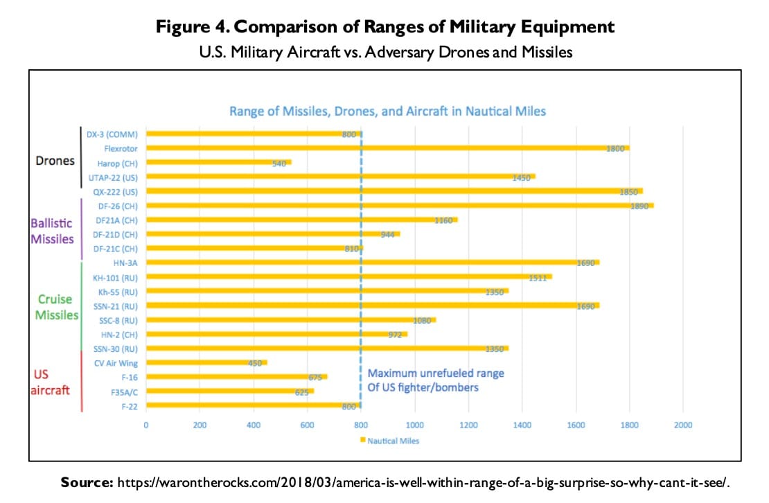 Again, the entire American tactical model is penetrating deep into enemy airspace and dropping bombs. The distance these bombs can go has increased, but America still has to risk expensive jets to deliver them. As you can see from the Precision Guided Munitions report (above), American jets now have to fly within firing range and, worst of all, park within firing range also. As former CENTCOM commander Frank McKenzie said, “the thousands of short-range missiles that Iran possesses are a factor here. There is no strategic depth. An F-35 is very hard to hit in the air. On the ground it is nothing more than a very expensive and vulnerable chunk of metal sitting in the sun.”