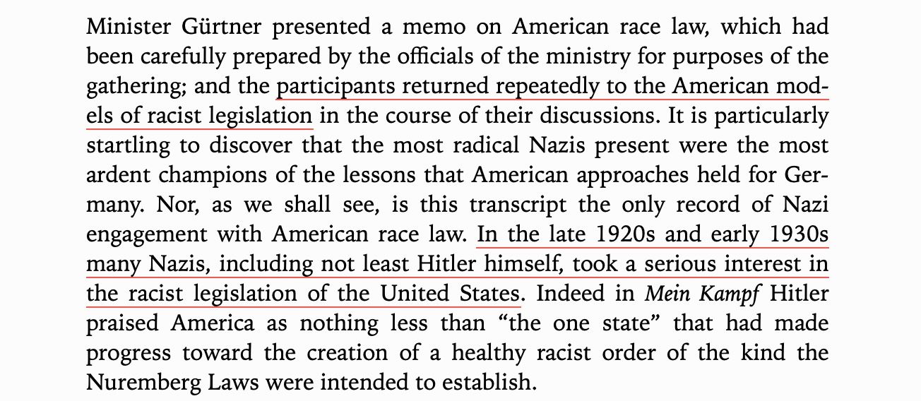 Far from being the freedom-loving nation that defeated the Nazis (as all the movies portrayed), America was the nation that inspired the Nazis, which just got entangled to protect other white supremacist states. As James Q. Whitman wrote in Hitler’s American Model, "many Nazis, including not least Hitler himself, took a serious interest in the racist legislation of the United States."