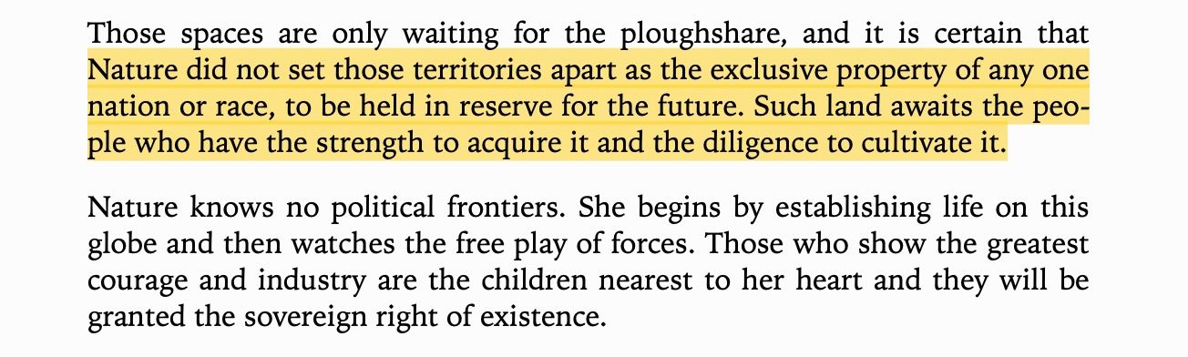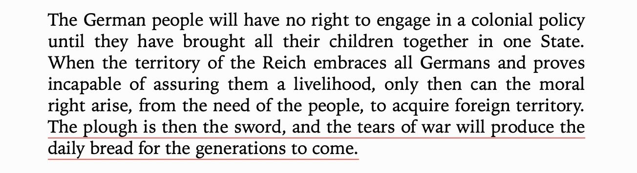 He said this was the source of American strength. It was inspirational to him. Hitler's real mistake was not that he was a brutal, genocidal colonizer. His mistake was that he tried it on white people. Yet if you get over the racism, the underlying colonial logic is the same. Mein Kampf just says the quiet parts out loud. As Hitler said, "the plough is then the sword, and the tears of war will produce the daily bread for generations to come."