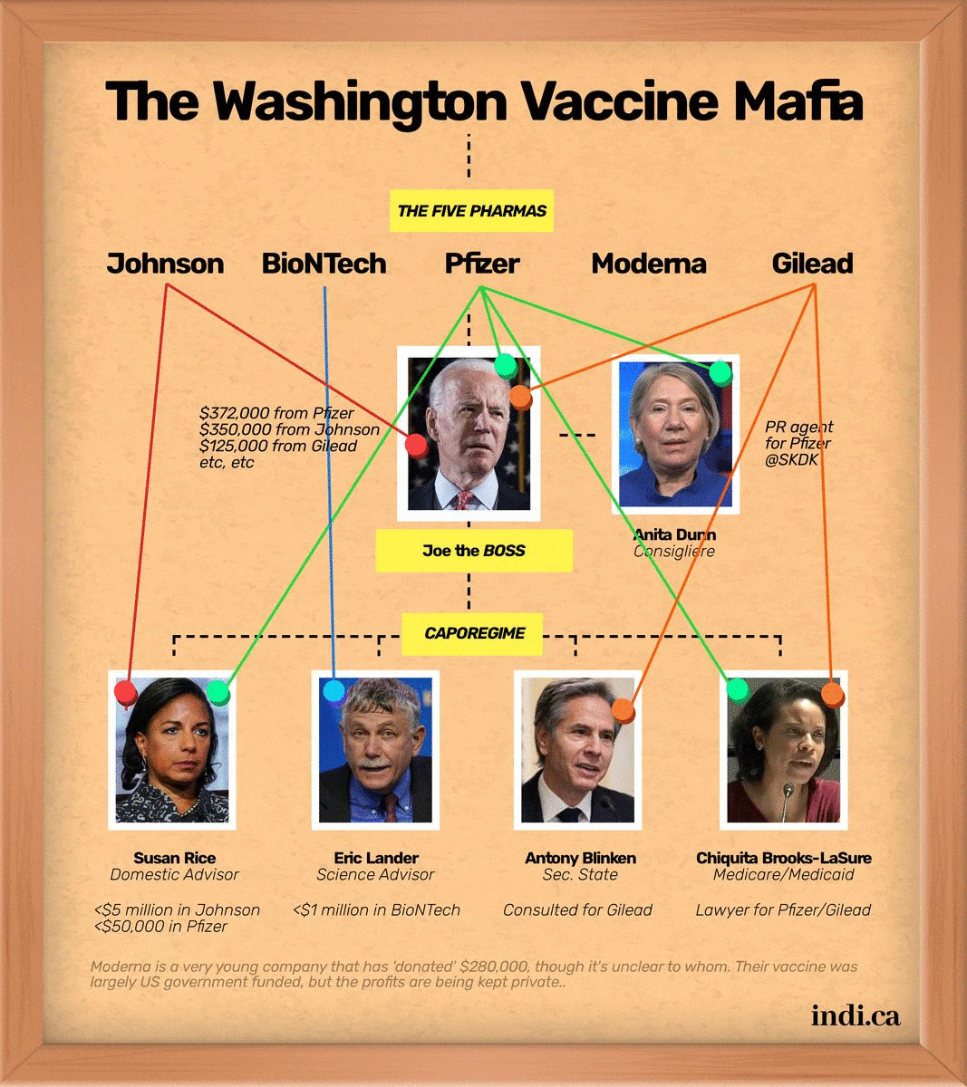 All of these people stand to directly profit from the drug companies, and so give a fuck about a People’s Vaccine. They’re vaccinated, Americans will get vaccinated, and any mutated blowback is years aware. They’re loading up their retirement funds NOW. It’s a diverse looking crew, but disclosure don’t lie. You shouldn’t be owning shares in shit you’re supposed to be regulating. You shouldn’t be depending for work on the people it’s your job to control. Biden and his team all do.
