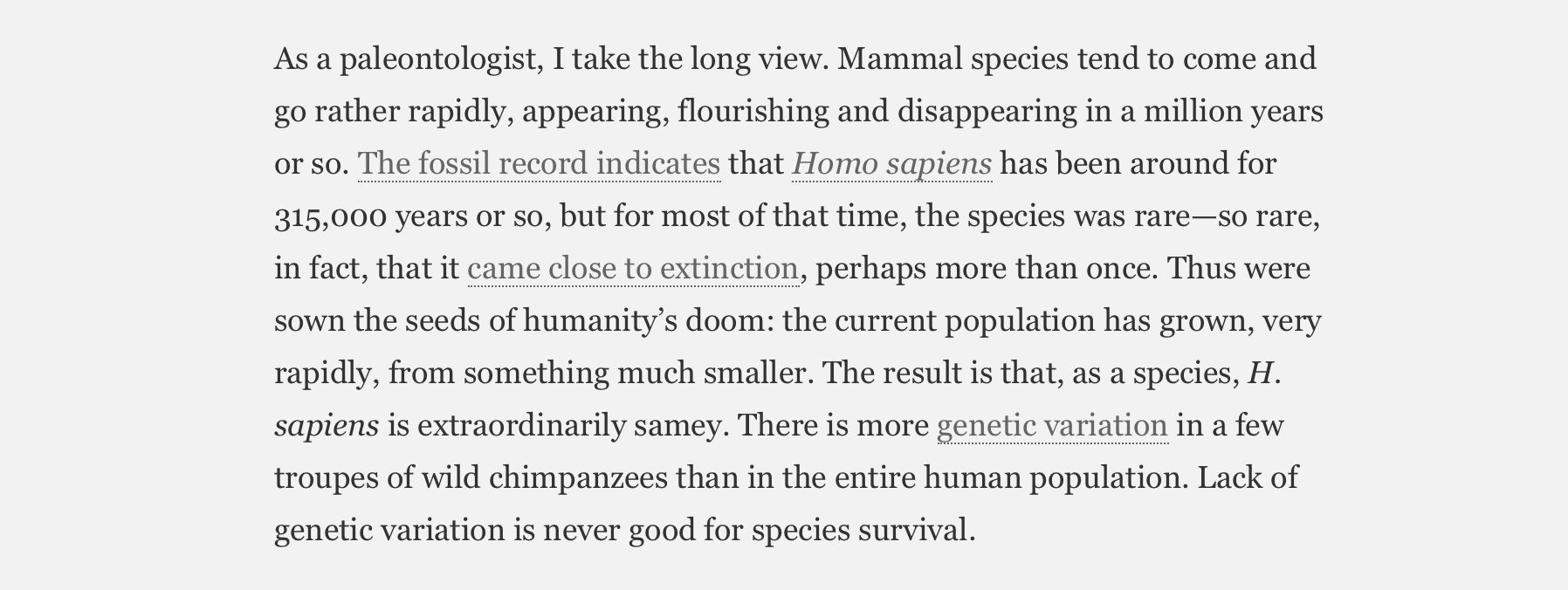 If you think about us as a species, we're actually a very small genetic deck, barely shuffled. Homo sapiens are what evolutionary biologist Henry Gee calls "extraordinarly samey." He comes to the conclusion that we're doomed to go extinct. In the long run this is undeniable.