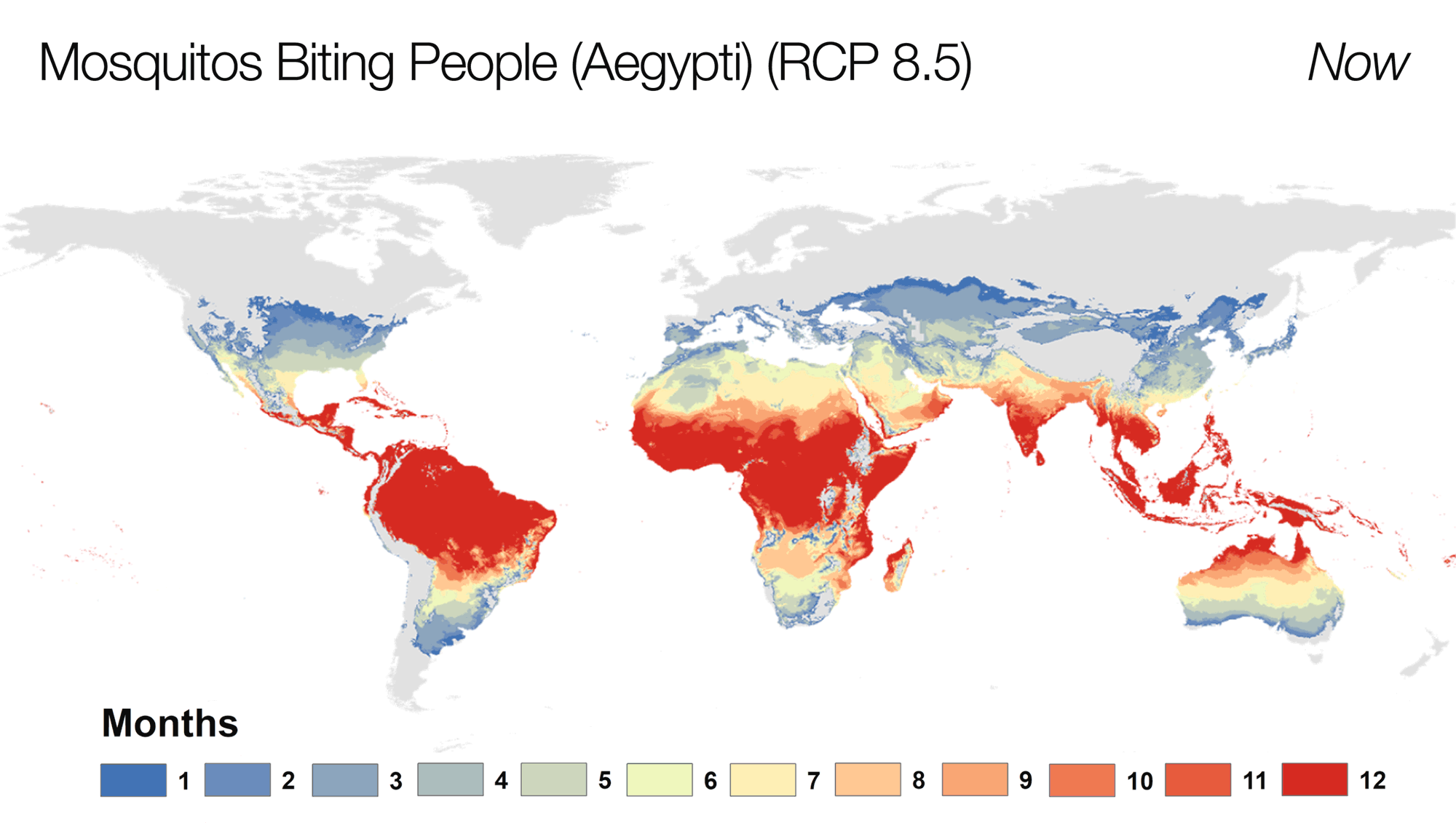 First thing is that the colors apply to the months when the mosquitoes will be biting your ass. Red means they’re biting all year, and blue is just one month out of twelve. As you can see, under RCP 8.5 (business as usual), Ae. aegyptis mosquitoes will spread up to the UK by 2080.