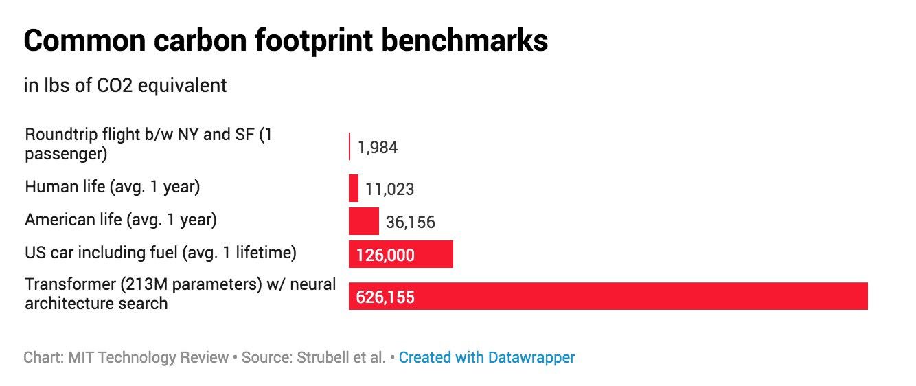 The direct energy consumption of AI is pound for pound, one of the most carbon-intensive activities in history. The chart above shows the footprint of training a common AI model circa 2020. Beginning to think emitted nearly 60x more carbon than serving the needs of an average human host for a year.