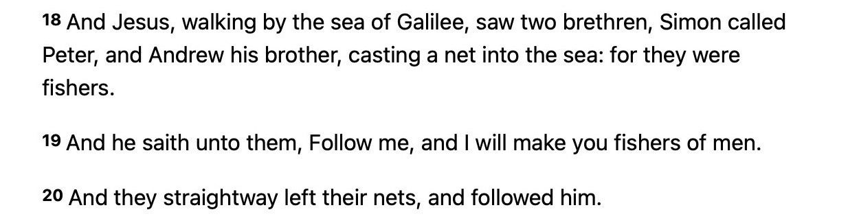 As you can see, Jesus quickly erects a scaffolding of metaphor to get into their brains. He doesn’t say I need you to evangelize or proselytize, he says I need you to fish. These dudes are literally sitting there with nets in their hand, it makes total sense. The greatest carpenter has very quickly put up some metaphorical scaffolding and gotten into their heads.