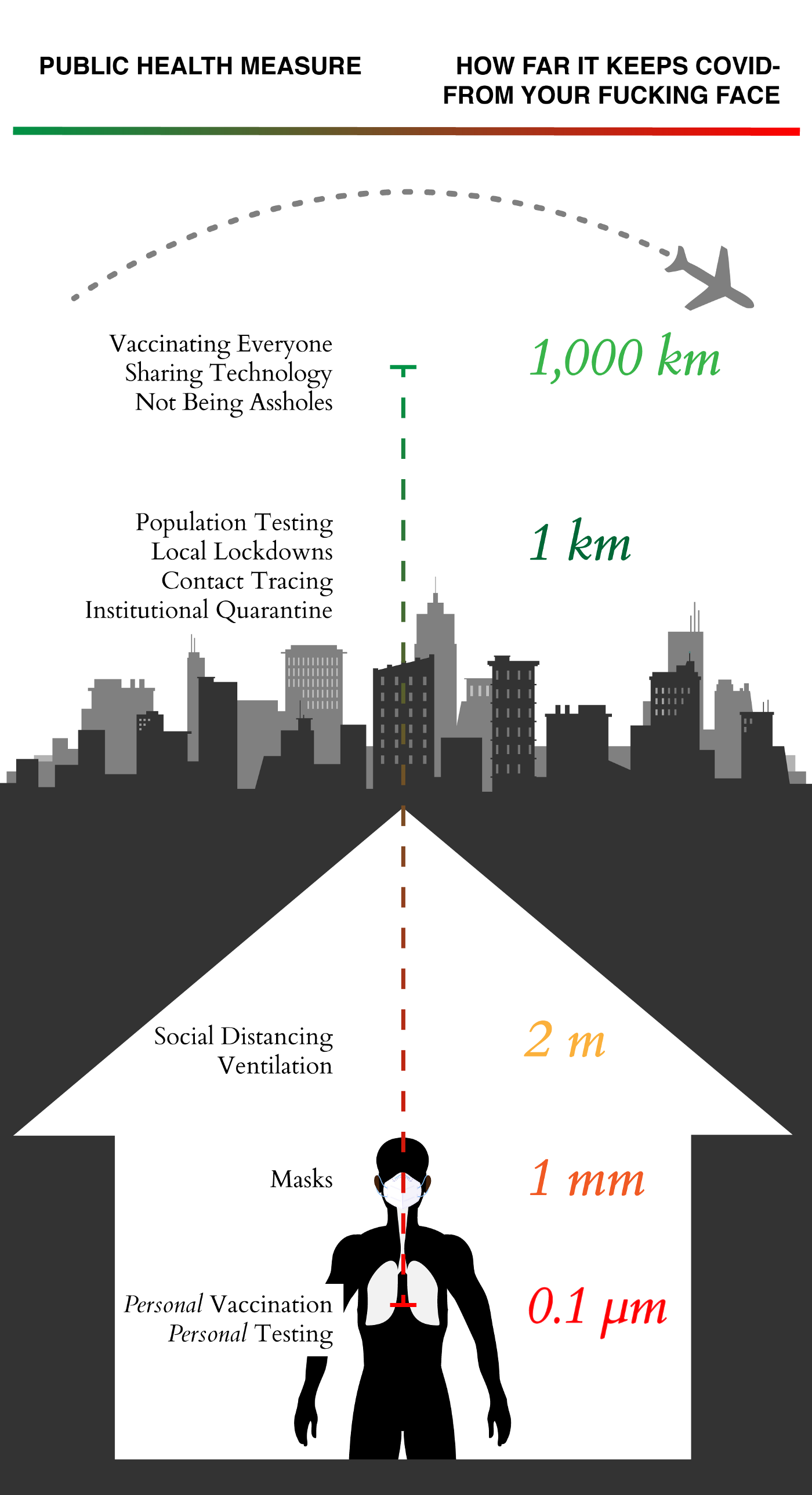 So in this article I just show the reader COVID interventions inside their body (vaccines), on their face (mask), and then just walk them further and further away until they get to a sane, city/national level response (test/trace/isolate/cooperate).