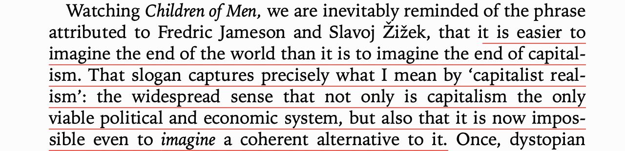 Capitalist Realism puts a name to this soul-deadening feeling, that constant voice saying 'Gotcha! You said that on an iPhone!' The feeling that this is the only possible reality simply isn't correct. You can feel different, even from within this ideology. That's how every new ideology is born.