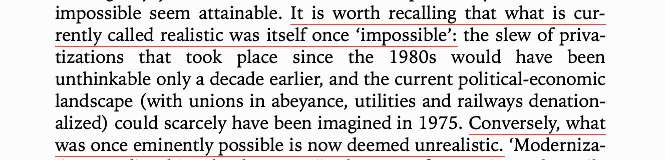 Fisher sadly died, but the spectre remains, its realization more urgent than ever. We live in a time where capitalism has fallen on its face over and over, with the every financial crash, with its inequities and failures during COVID-19, but still the zombie emperor lumbers on. More and more fingers reach out from the crowd, saying "the motherfucker has no clothes!" but still it lurches on. Change seems impossible until it happens, and then it seems impossible that the past ever was.